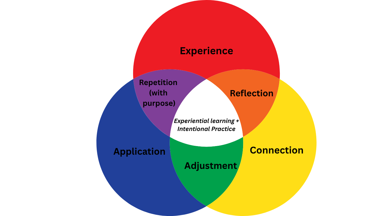 Experiential Learning provides the context—the real-world scenarios where learning happens. Individuals with intentional practice actively refine their skills within those experiences. Together, they create a cycle where: